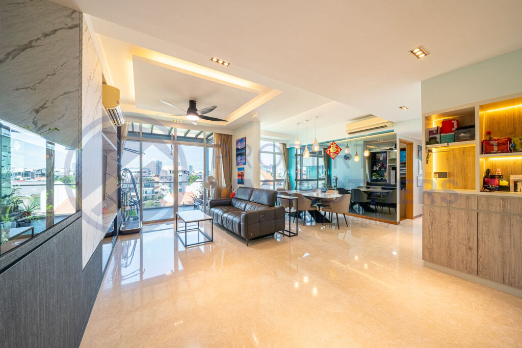 Rare freehold duplex penthouse spanning 2,379 sqft, originally 5-bed + study, now a spacious 4-bed with potential for 6 bedrooms. Enjoy a bright, airy north-south facing layout with quiet landed views. Level 1 features generous living/dining, balcony, kitchen, and 3 bedrooms. Level 2 offers a huge master suite, sauna bathroom, and terrace. Full facilities include […]